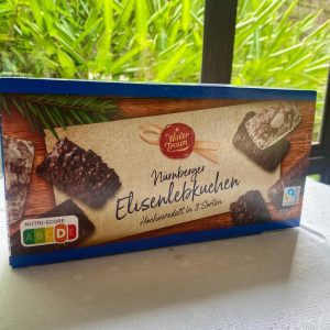 Traditional German Fruit Bread with marzipan, nuts, spices, and dried or candied fruit, coated with powdered sugar.